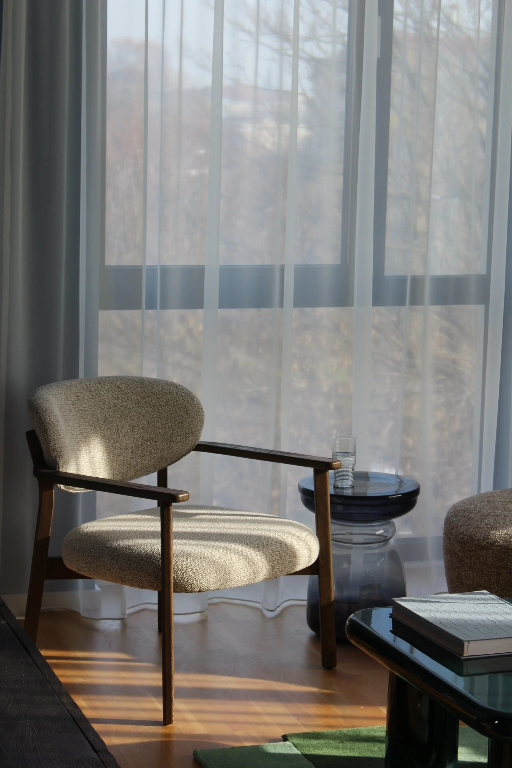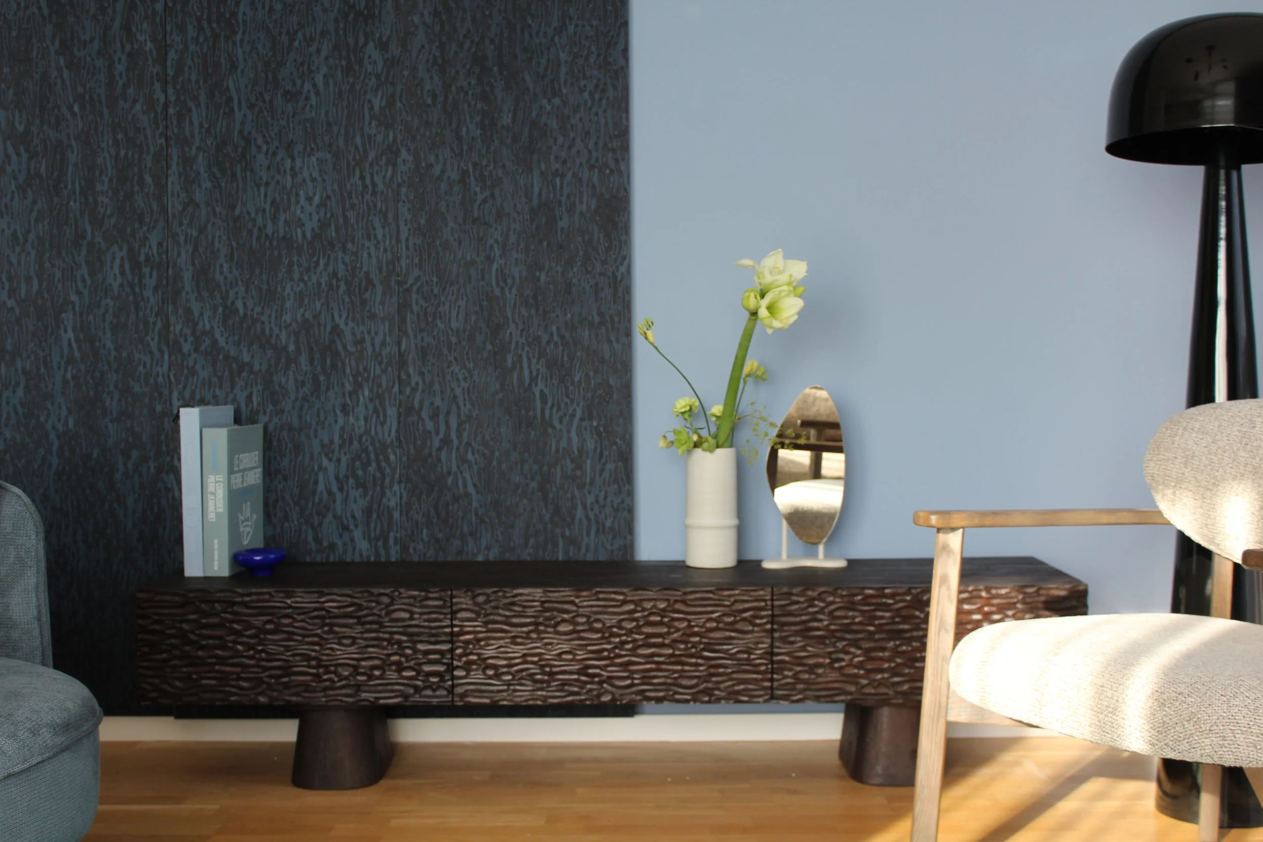 Paleta cromatică este dominată de tonuri profunde de albastru nocturn, gri antracit și accente de verde pădure, echilibrate strategic de luminozitatea pardoselii din lemn natural și a textilelor vaporoase.